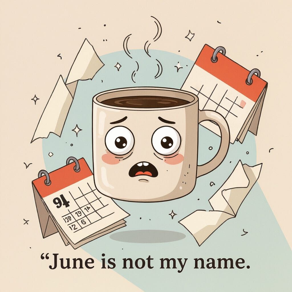 This image features a deadpan illustration of a tired coffee mug amidst torn calendar pages. A minimalist pastel background and subtle steam enhance the relatable, sarcastic humor.