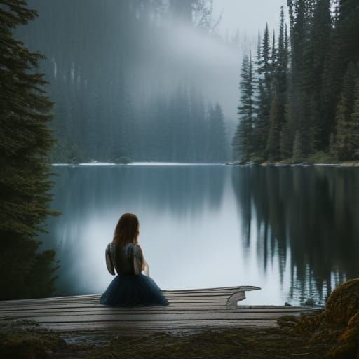A detailed pencil sketch of a woman in a white silk dress by a dark lake, reminiscent of John Bauer's Tuvstarr. The artwork features intricate details, evening light, and a misty forest backdrop.