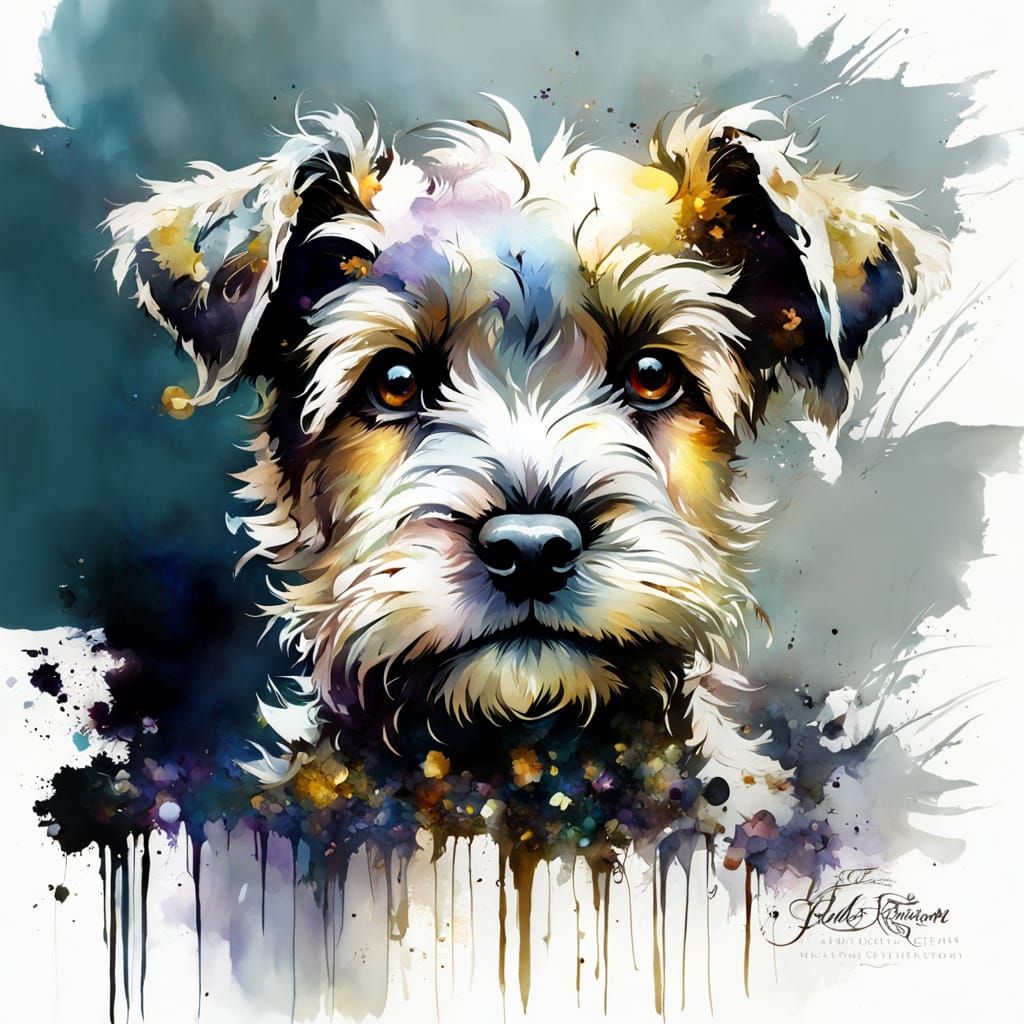 A charming image of a Scots terrier puppy against a white backdrop. The artwork features intricate golden patterns and a bokeh effect, rendered as a dark fantasy alcohol ink painting.