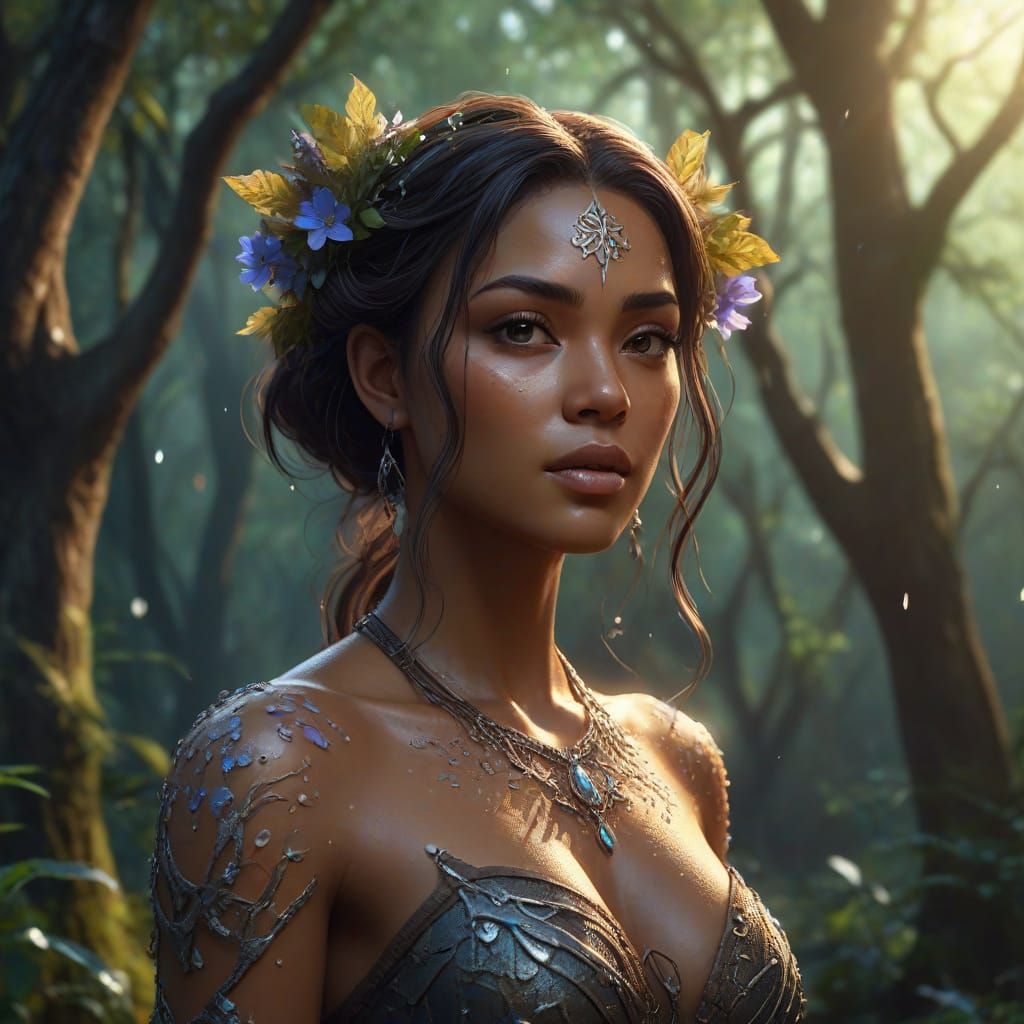 Concept art of a brown-skinned woman with bioluminescent flowers in her hair, standing amidst ancient trees with glowing runes in a mystical forest. Vibrant digital painting with ethereal lighting.