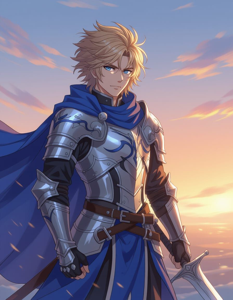 This image shows a confident anime-style knight standing on a cliff. The young man has dark blonde hair, blue eyes, light armor with blue accents, and a flowing blue mantle in cinematic lighting.