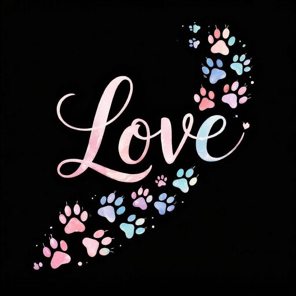This watercolor illustration features the word "love" in elegant script, surrounded by a trail of colorful paw prints in soft pastel shades. Artistic brushstrokes and bleeding colors create a charming, print-ready design.