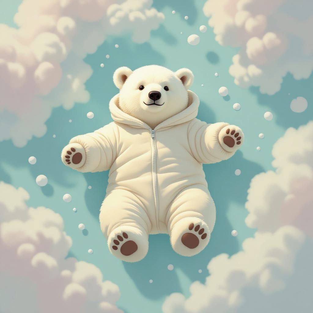 A charming image of a polar bear in a onesie, suspended in air amidst pastel mist. The artwork has a whimsical, dreamy quality akin to storybook illustration.