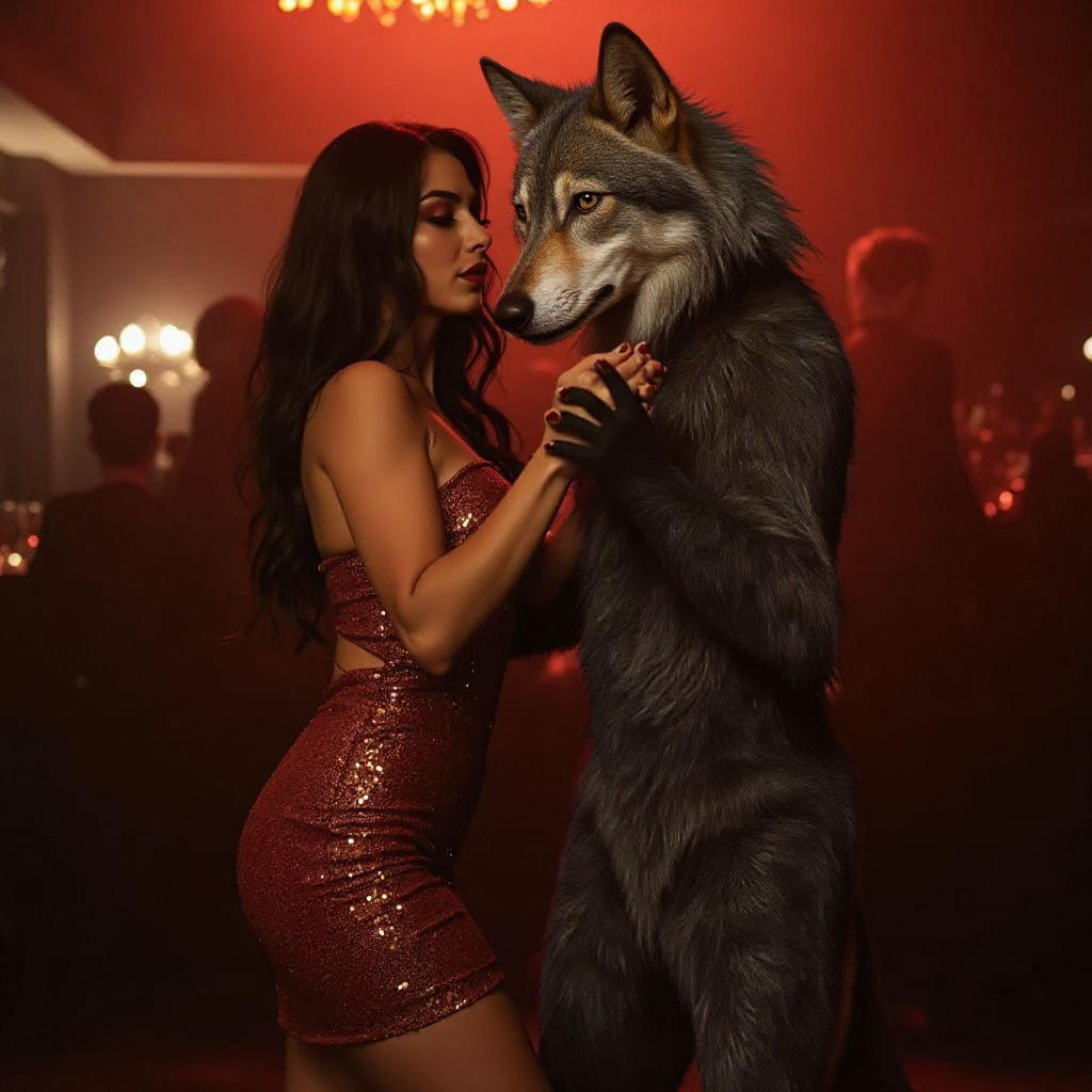 This image shows a dark-haired woman in a sequined dress dancing with a spectral wolf in a nightclub. The scene is rendered with vibrant colors and dynamic lighting.