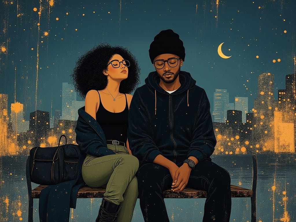 A soft impressionistic painting of a young Black couple on a park bench at night. City buildings glow with warm lights under a muted night sky, rendered with a warm, bluish palette.