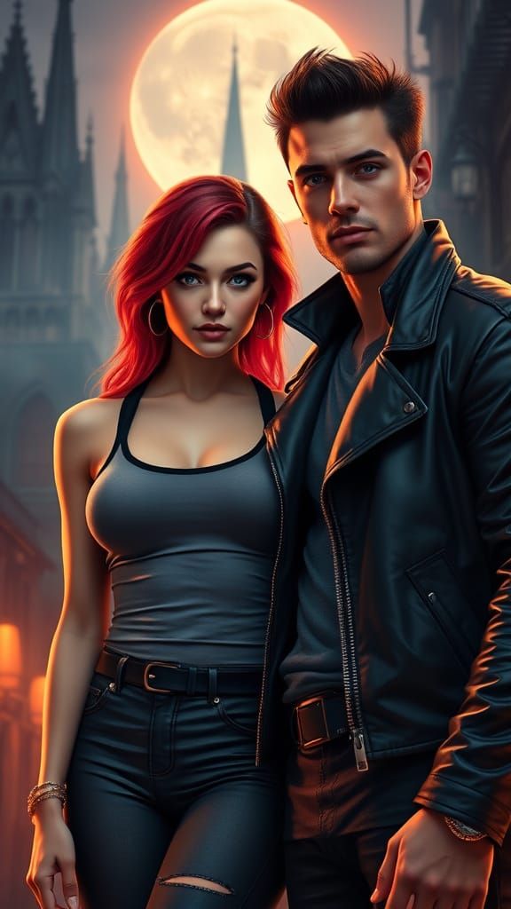 A striking image of a curvy woman with red hair and a handsome man in a cyberpunk city. The digital art captures their connection under ethereal moonlight.