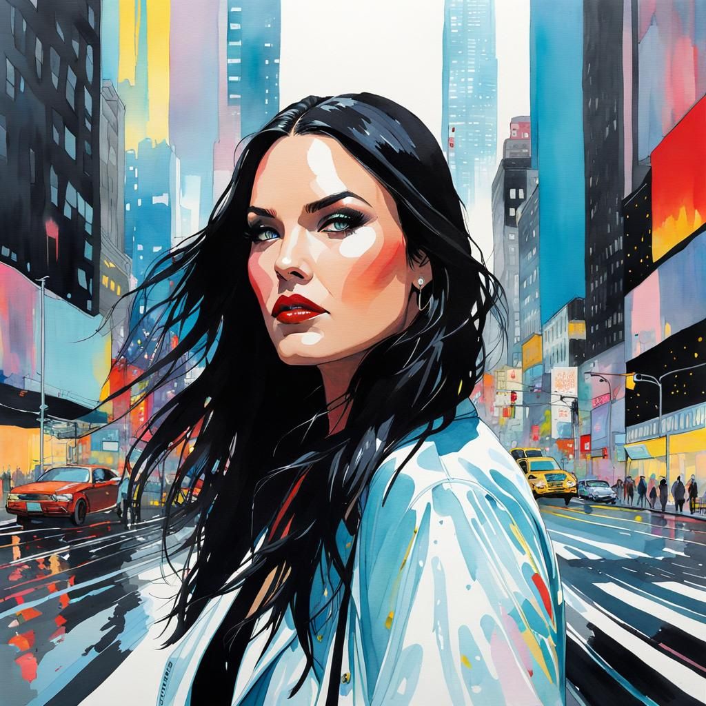 This image shows a detailed watercolor portrait of a young woman in an urban setting. The artwork features a wet-on-wet watercolor technique, reminiscent of illustrative art.