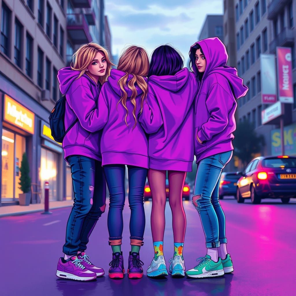This image shows two teenage girls embracing as best friends, set against a city street at dusk with a warm, electric atmosphere, featuring bold brushstrokes, neon accents, and a mix of digital and traditional media textures.