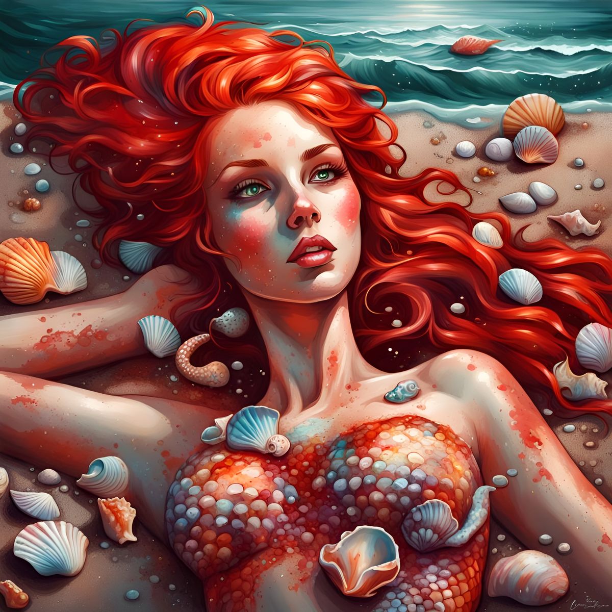 A vivid image of a red-haired mermaid resting on a shell-strewn beach. The artwork is rendered in a bold graffiti art style, with high contrast and ultra-detailed textures.