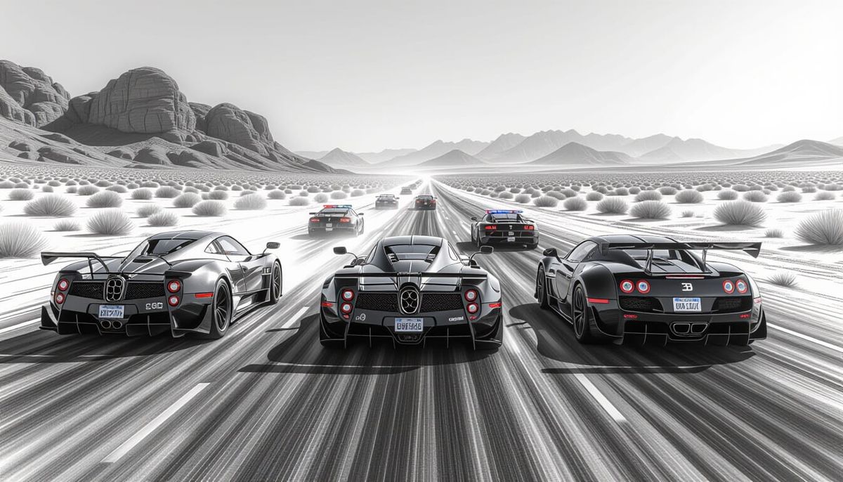 A dynamic charcoal drawing captures three hypercars speeding on a desert highway with police in pursuit. Features dramatic lighting, gritty textures, and high contrast.