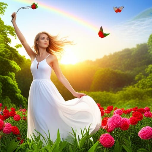 A picturesque scene of a woman on a flower-adorned swing at sunset. The image features a vibrant landscape filled with flowers, birds, and butterflies, rendered with fine details and complementary colors.