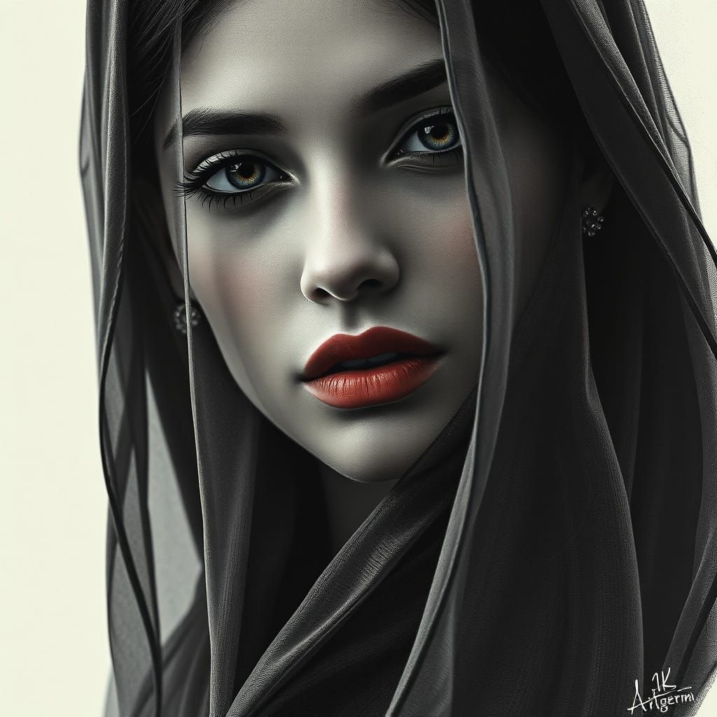 This stunning portrait shows a beautiful woman behind a veil, rendered in intricate charcoal details and triadic colors, with dynamic lighting and a touch of Art Nouveau flair, as if brought to life with Unreal Engine 5 effects.