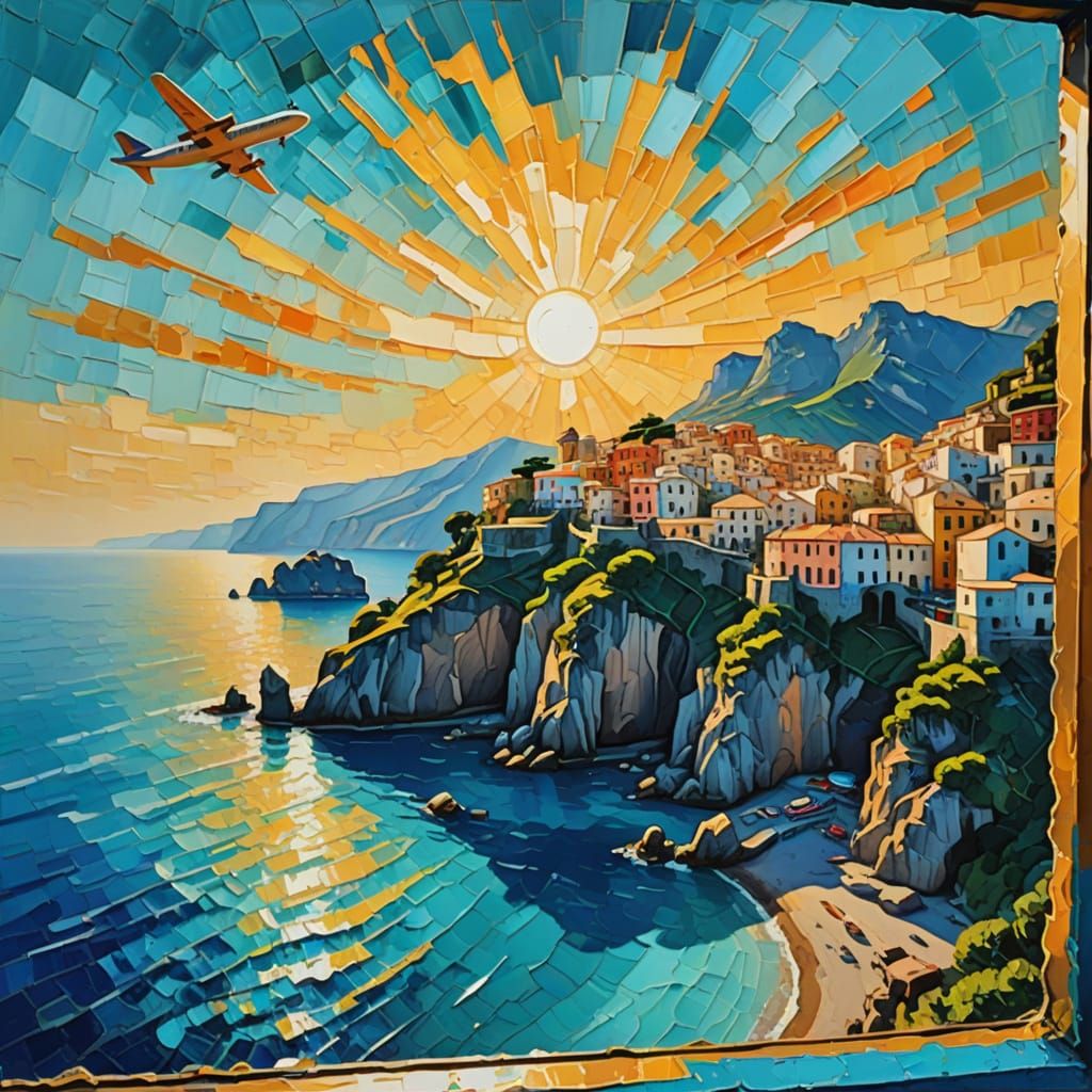 A vibrant neo-impressionist painting of the Amalfi Coast viewed from an airplane window. The image showcases the coastline's rock formations, turquoise water, and warm golden light with thick, colorful textures.