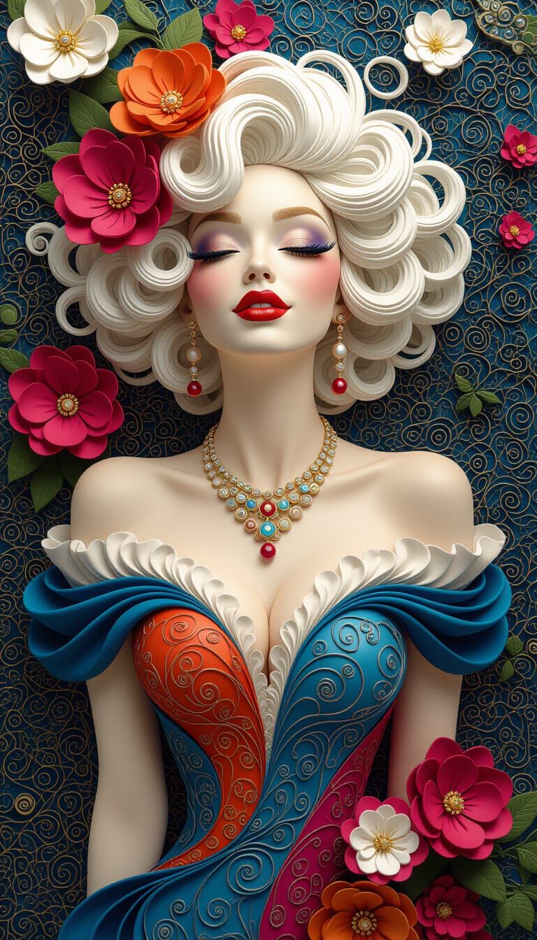 A striking picture of a curly-haired albino woman in an elaborate gown, smiling playfully. Resin wire art flowers bloom around her in a hyperdetailed image with Escher-esque architecture.