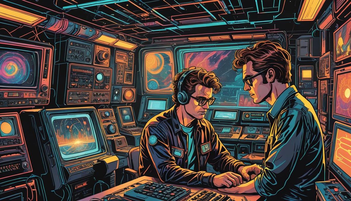 This image shows Mark Brooks and Dan Mumford in a retro-futuristic comic book art style. Vibrant pop art colors, neon lights, and 1970s style film grain create a nostalgic atmosphere, reminiscent of psychedelic art.