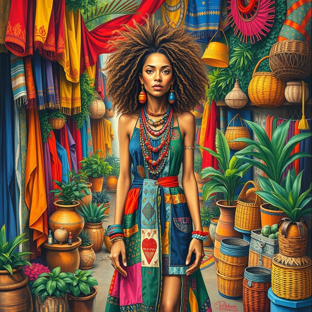 This image depicts a free-spirited woman amidst a kaleidoscopic marketplace, surrounded by vibrant textiles, vintage trinkets, and lush greenery, rendered in the bold, expressive style of the CoBrA Group, characterized by thick brushstrokes and primal colors.