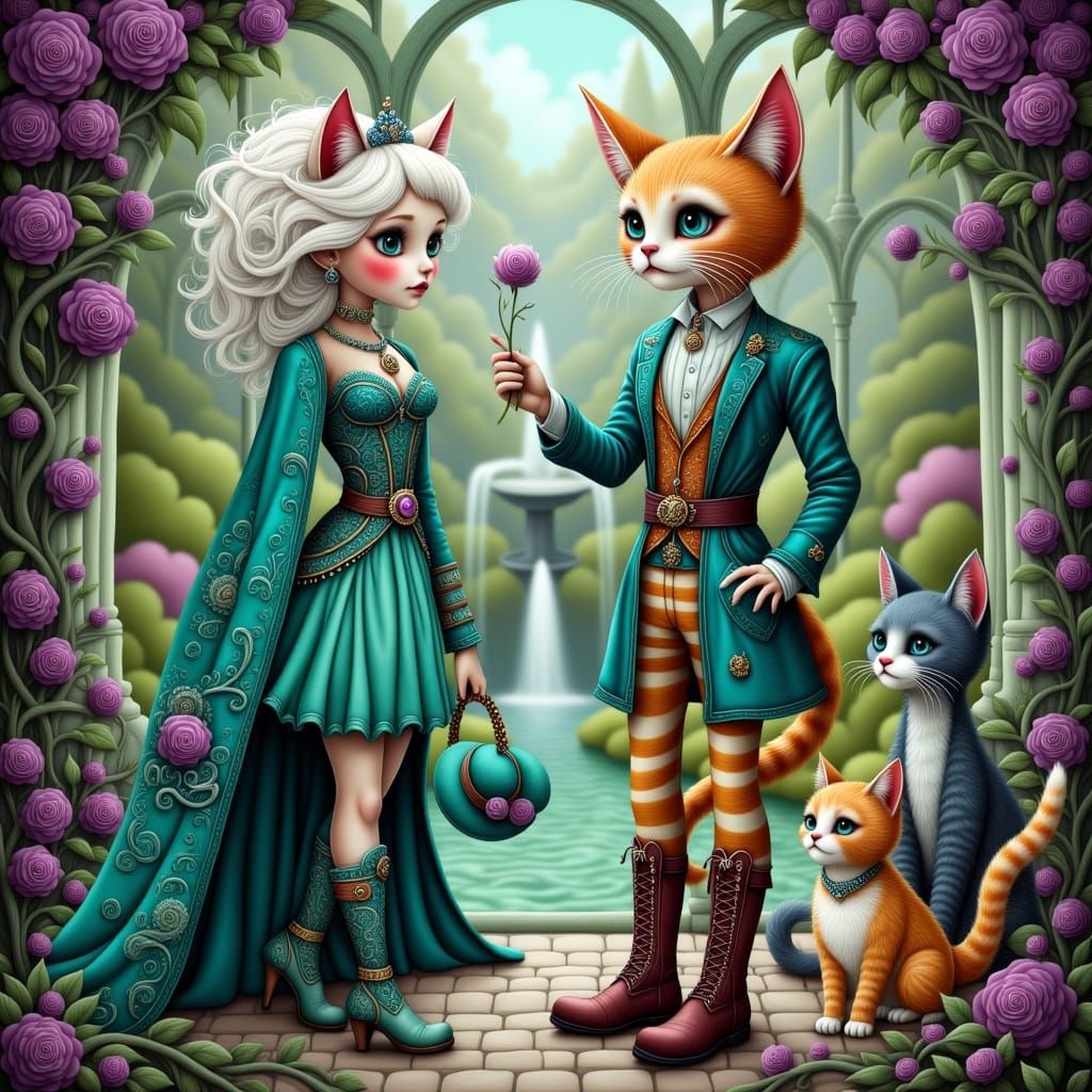 This whimsical image depicts a young steampunk princess greeting a handsome striped ginger cat in a lavish royal garden setting, surrounded by ornate archways and exotic purple flowers.