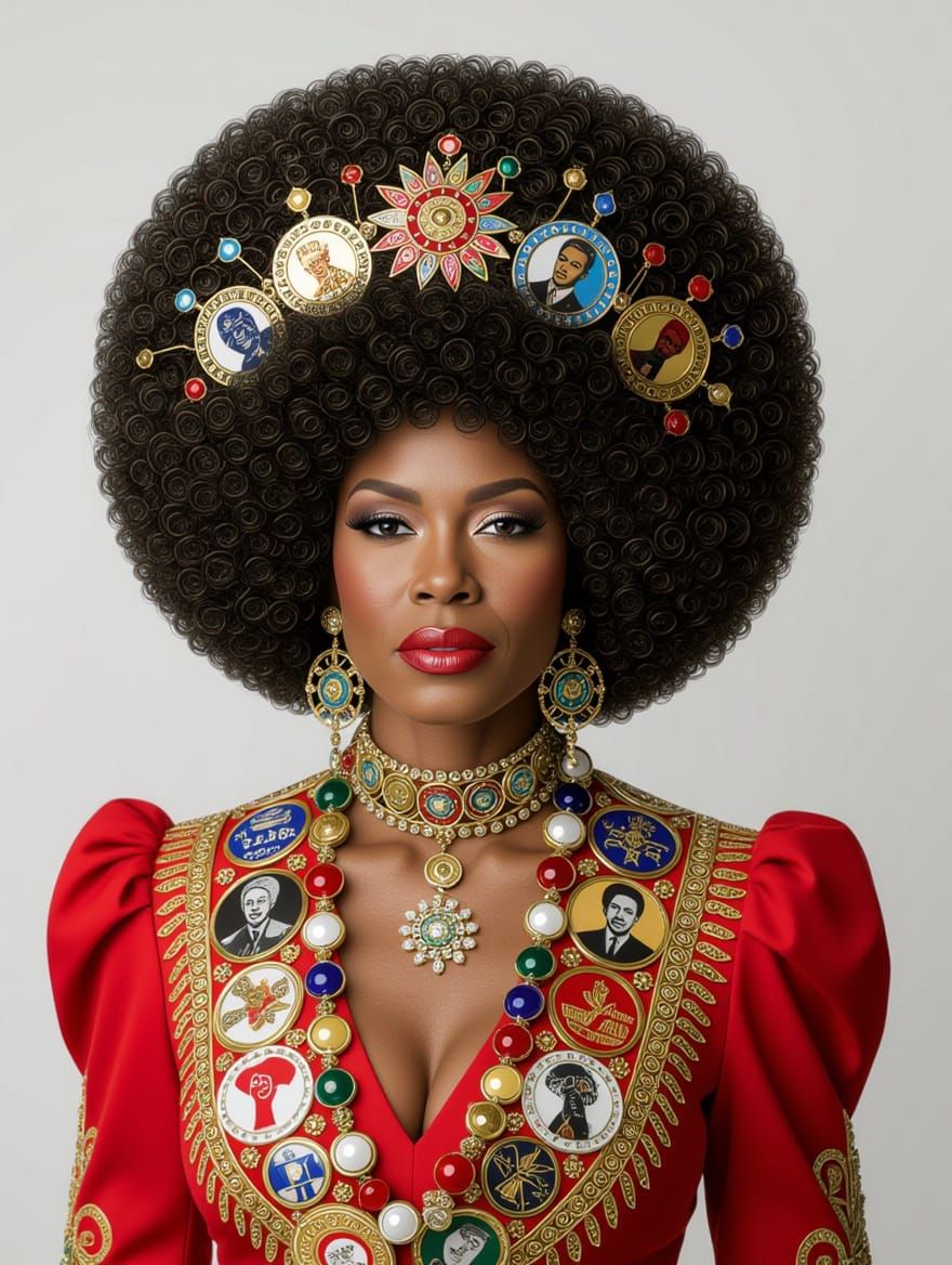 This striking image features a person with a large afro adorned with civil rights symbols. The artwork has a dystopian aesthetic and celebrates afro beauty.