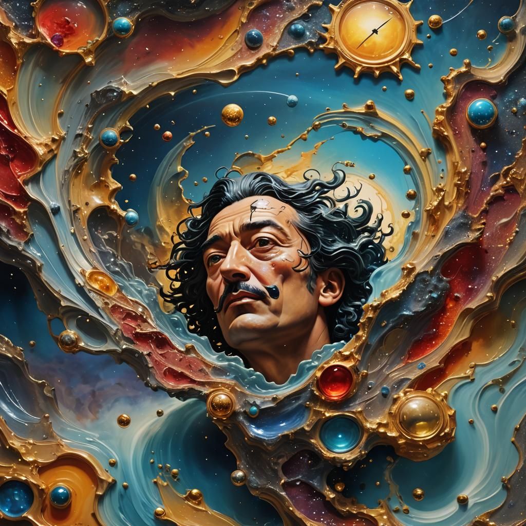 This image shows a dramatic, hyperrealistic scene of a lava river with intricately detailed, distorted celestial bodies in the background, reminiscent of Salvador Dali's melting clocks, with a colorful background and a 2/3 face angle shot.