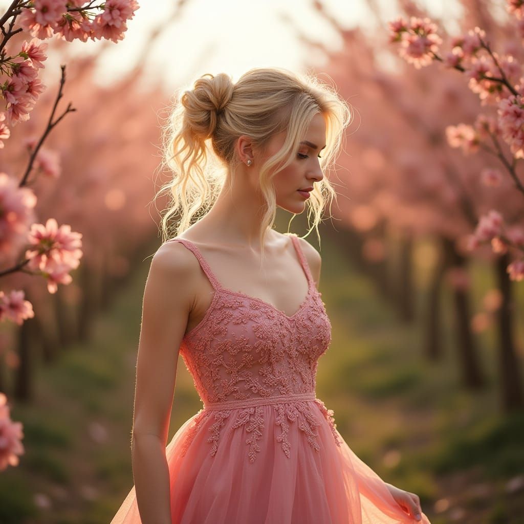 A hyperrealistic image of a blond European woman with an elegant chignon. She wears a pale pink dress with delicate embroidery while walking serenely in a flower-lined path with soft lighting.