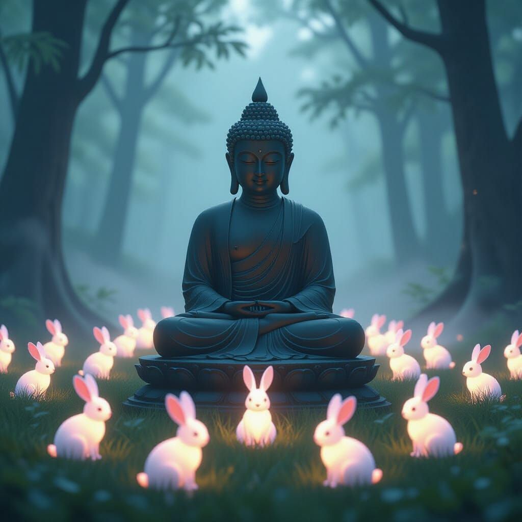 Easily generate unique images of Buddha and glowing rabbits with our free AI tool. Get creative now!