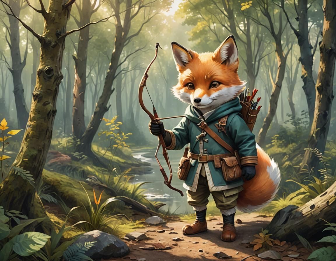 This image shows an anthropomorphic fox dressed as an archer in a sun-drenched forest clearing. The digital watercolor painting captures a cinematic, detailed, and atmospheric scene.