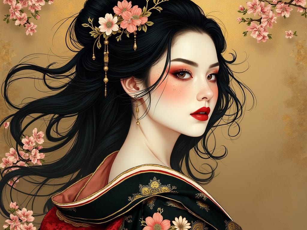 This image depicts a stunning geisha with a lavish black and gold kimono, adorned with cherry blossom patterns, and a raven-haired beauty with bold, vibrant makeup and delicate golden accents, evoking the elegance of Japanese ukiyo-e and Art Nouveau styles.