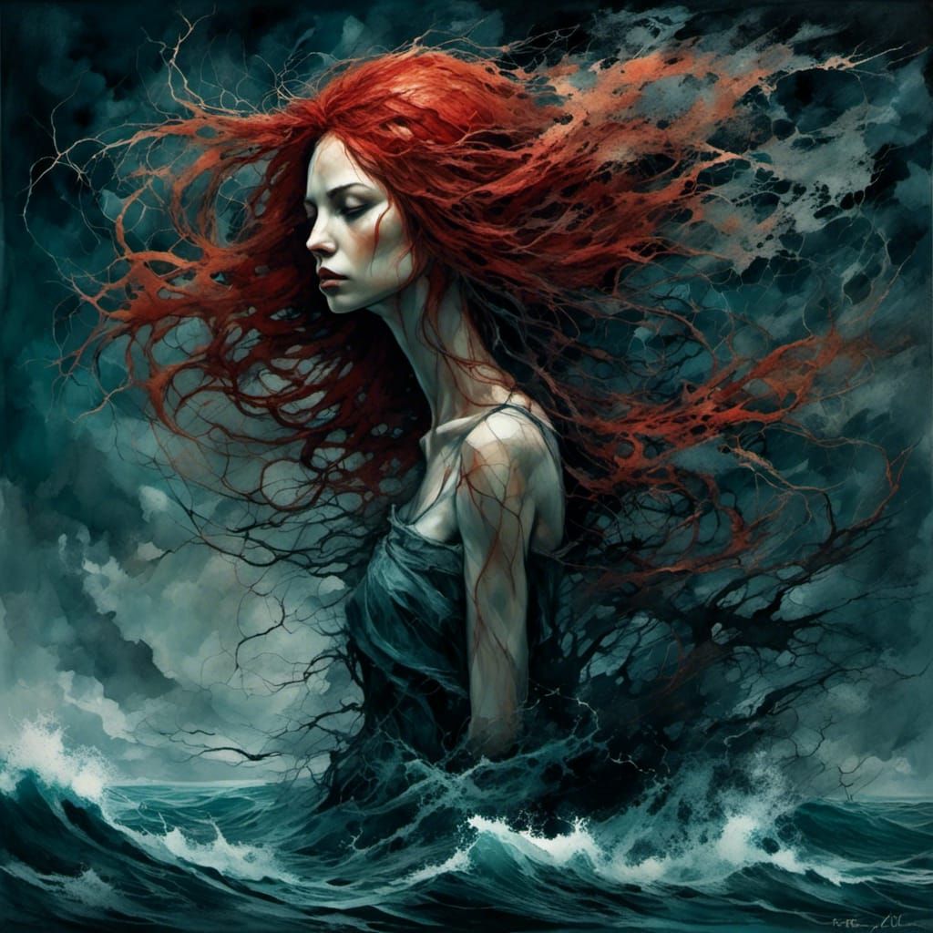 This image shows a siren with long red hair and shimmering scales emerging from rough seas during a thunderstorm. The depiction is highly detailed and realistic.