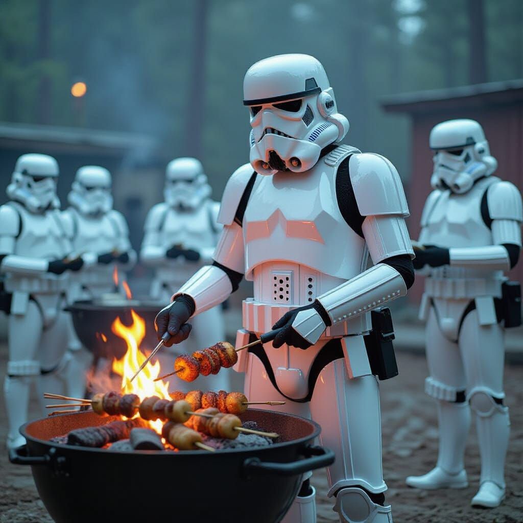 This image shows a group of stormtroopers having a barbecue. The scene blends futuristic industrial design with vibrant digital painting and textured sci-fi elements.