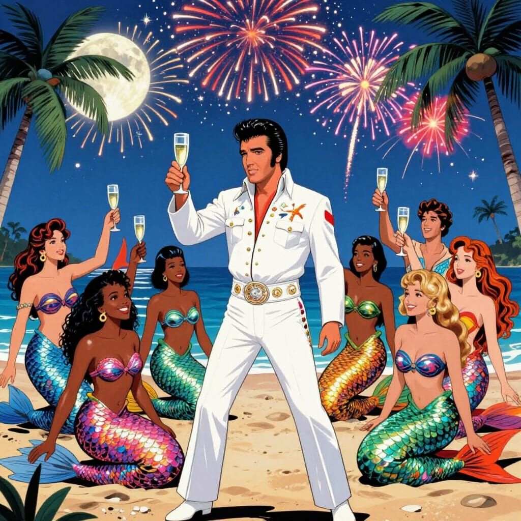 Generate your own unique images of Elvis Presley and mermaids celebrating New Year's Eve with our free AI tool. Easy and fun!
