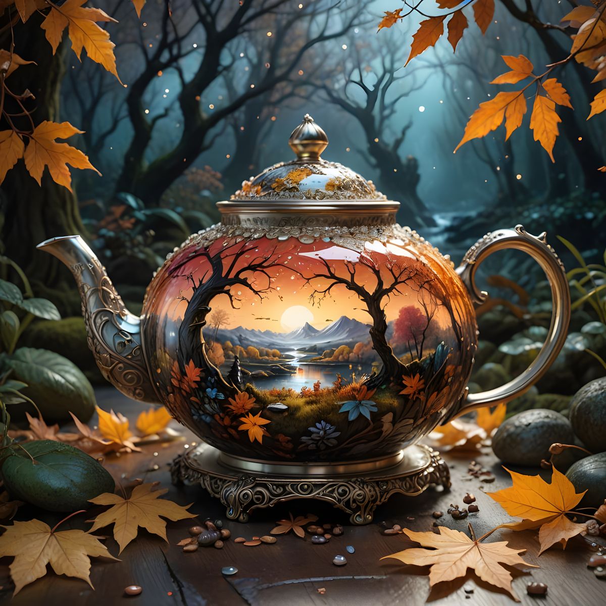 "Stunning and beautiful starlit autumn landscape pouring out of a delicate crystal teapot!!!"