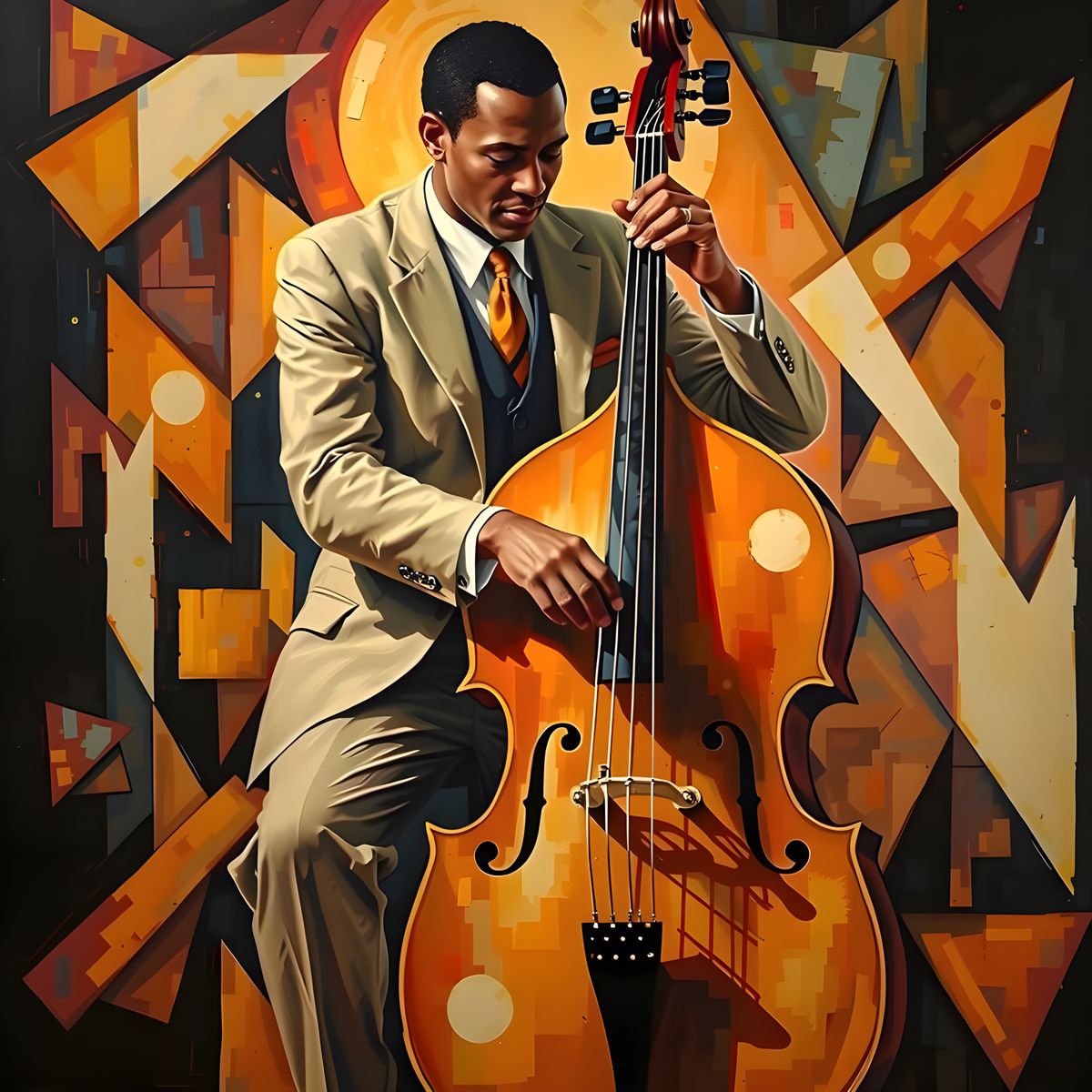 A 1950s-clad African American musician plays a double bass with fingerstyle technique, set against a dynamic, abstract cubist background in shades of white, brown, and gold, evoking the rhythm and energy of jazz music.
