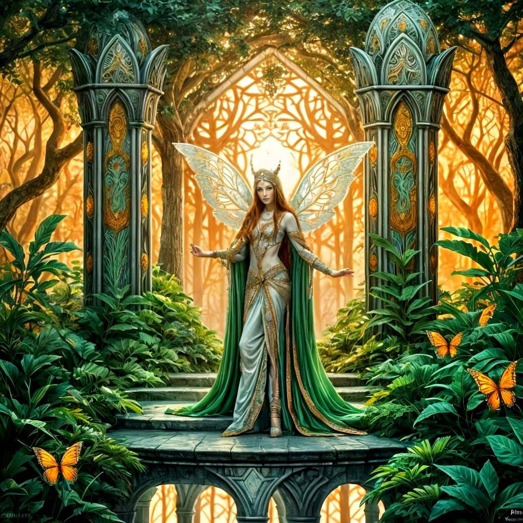 A digital image of a forest fairy with orange wings wearing a green and orange silk dress. The dress features silver patterns inspired by Egyptian and Mesopotamian art.