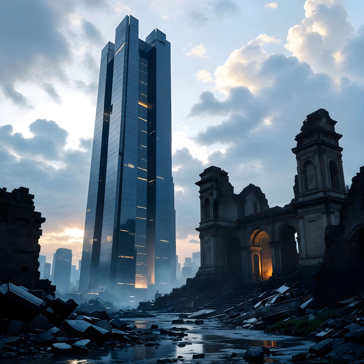 This image shows a modern skyscraper made of glass and steel standing next to an ancient, crumbling ruin. The scene is rendered with cinematic lighting and sharp focus, emphasizing the contrast between progress and tradition.