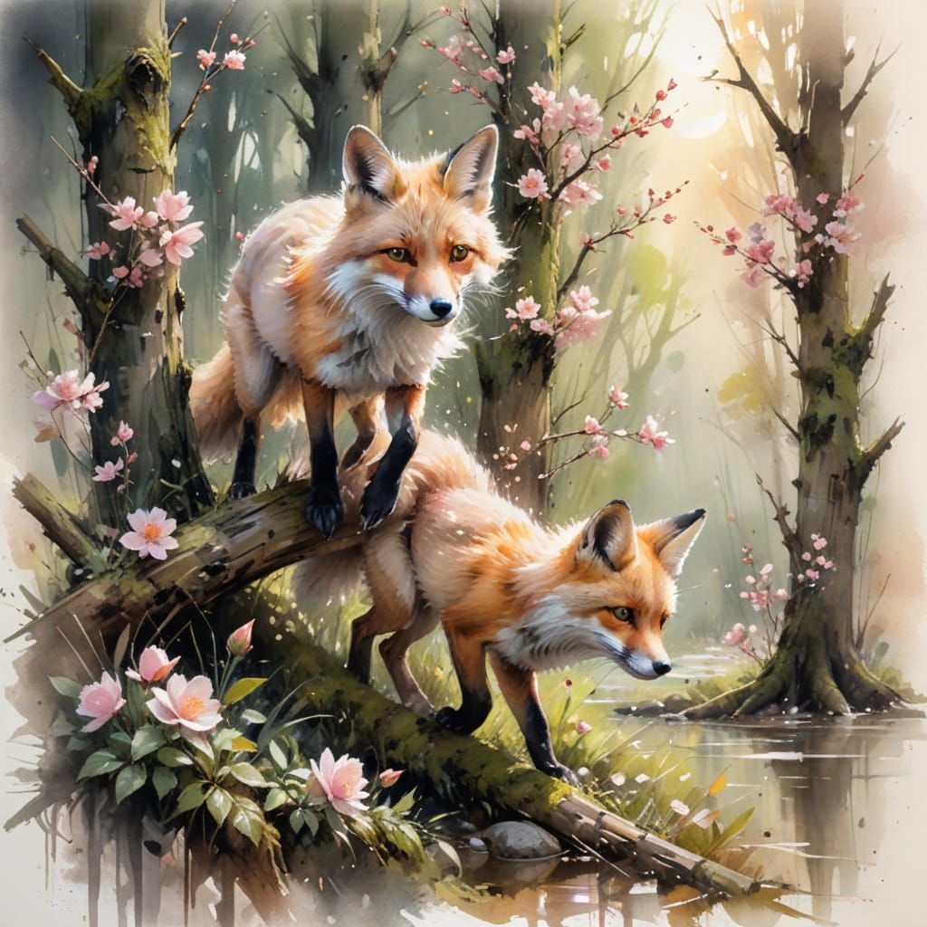This image shows a springtime cherry blossom orchard scene with young foxes playing. The artwork uses impressionistic techniques with soft charcoal outlines and an earth-toned watercolor palette, bathed in ethereal rose-hued light.
