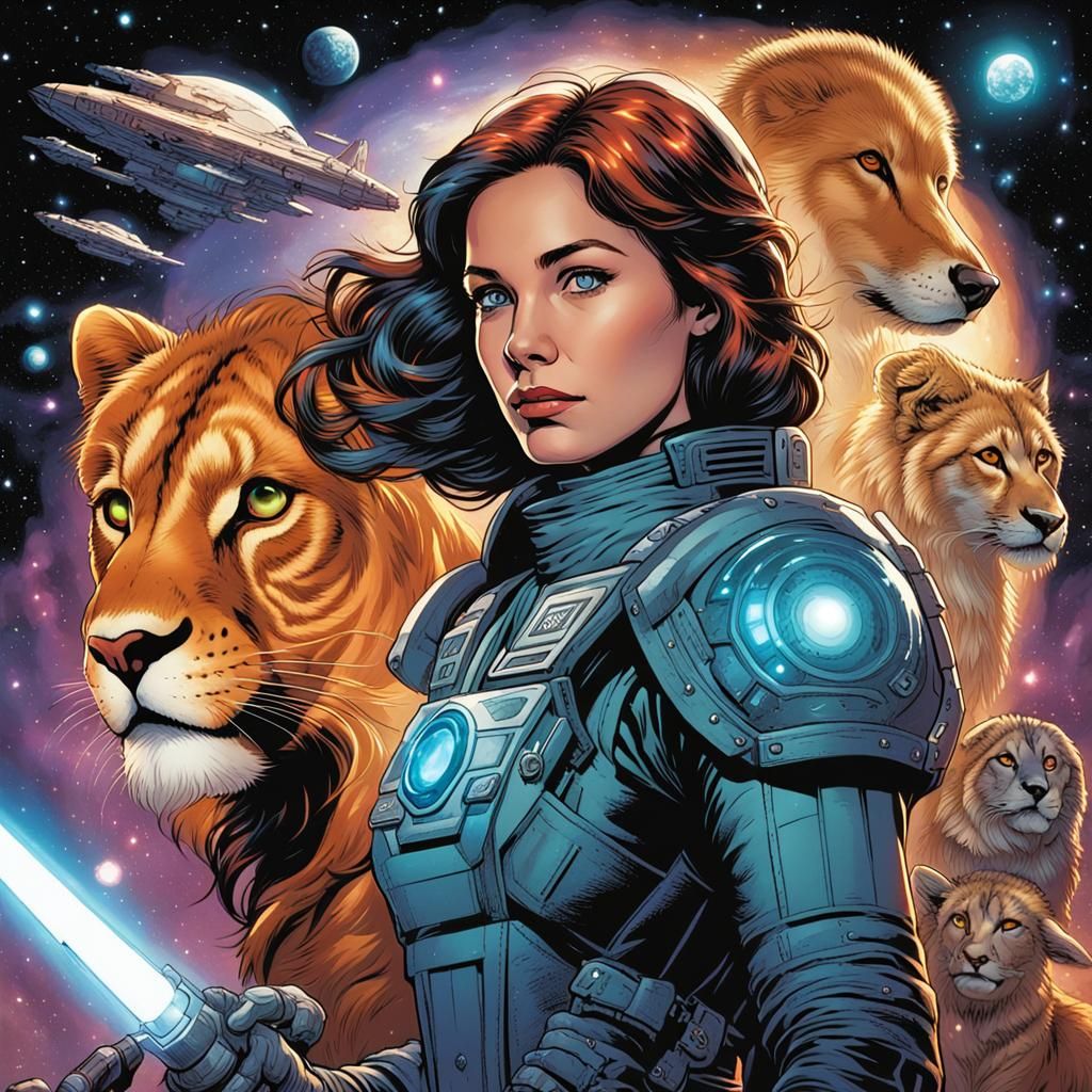 A comic book style image of a super-galactic woman advocating for human and animal rights. The artwork features bright, vibrant colors and smooth, refined lines.