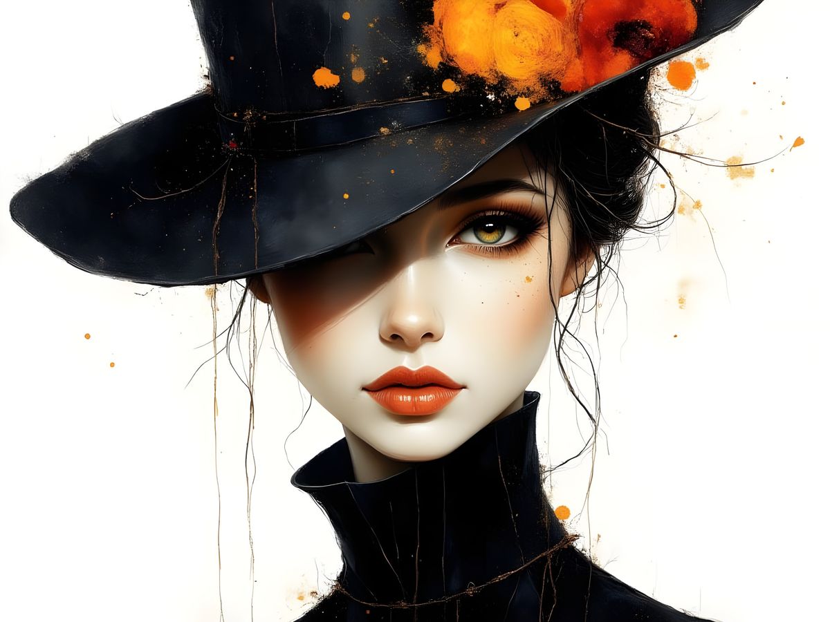 <lora:Earth and impression:1.0> <lora:divineOil:1.0> <lora:Hand Drawn Bohemian:1.0> Envision a surreal abstract portrait of a woman's face, her features fragmented and distorted, wearing a tilted hat that obscures one eye, with only her lips visible. The background is a stark white, emphasizing the dramatic ...