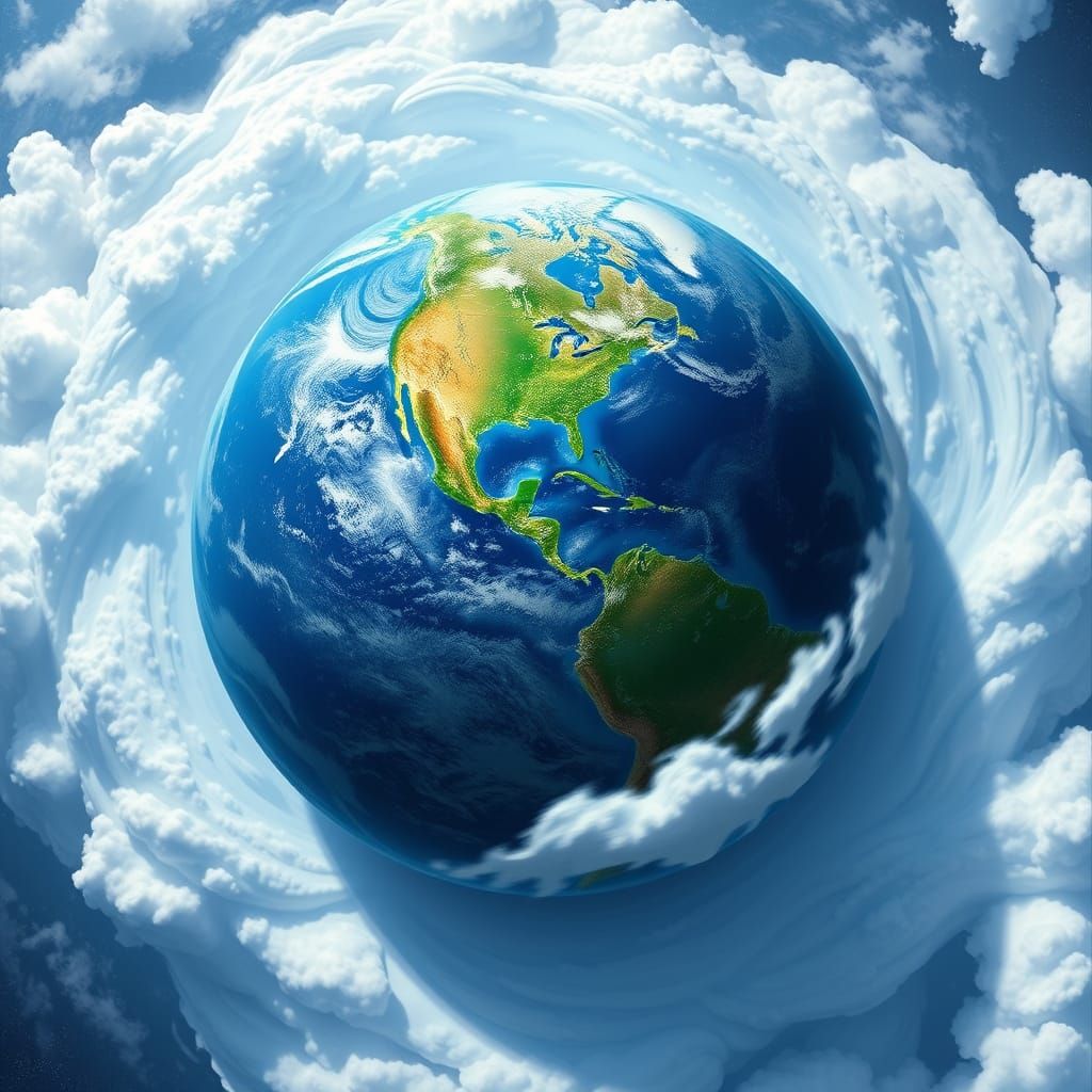 A breathtaking view of planet Earth as a vibrant blue and green globe, surrounded by swirling white clouds and vast oceans. The image blends realism with futuristic elements.