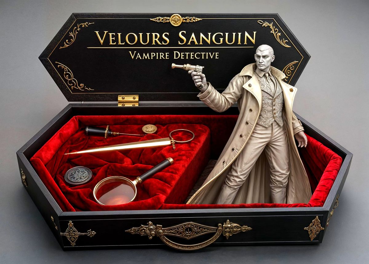 This image showcases a collectible action figure of Velours Sanguin, a vampire detective, in a luxurious coffin-shaped box with intricate gothic details and velvet interior. The figure is posed in dramatic noir lighting with accessories and a city skyline in the background, featuring a vintage comic aest...