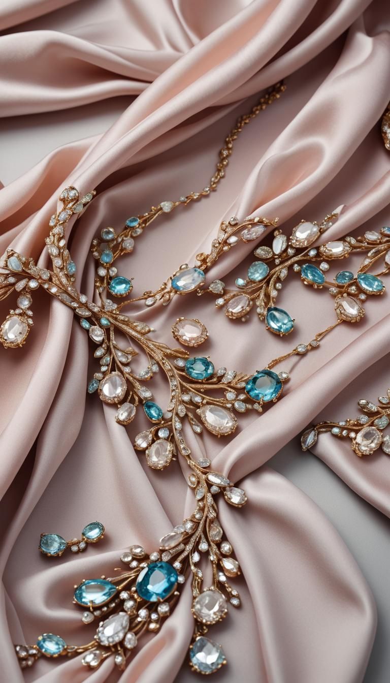 A close-up fashion portrait of a beautiful woman. She wears luxurious modern clothing and sparkling jewelry. The macro shot captures the rich textures and delicate folds of silk in soft, natural light. The image has a vibrant, glossy aesthetic.