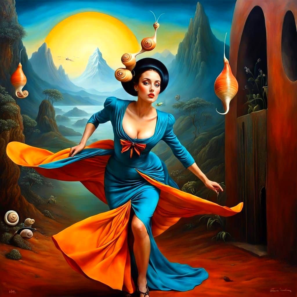photorealistic beautiful 40-year-old lady moving energetically in fantastic scene with strange fantastic snails; lady is running, jumping, reaching, balancing, climbing, turning, active energetic motion, fast dynamic motion; by Esao Andrews, Bill Carman, Fabio Hurtado, Salvador Dali, Joan Miro, Hieronymus ...