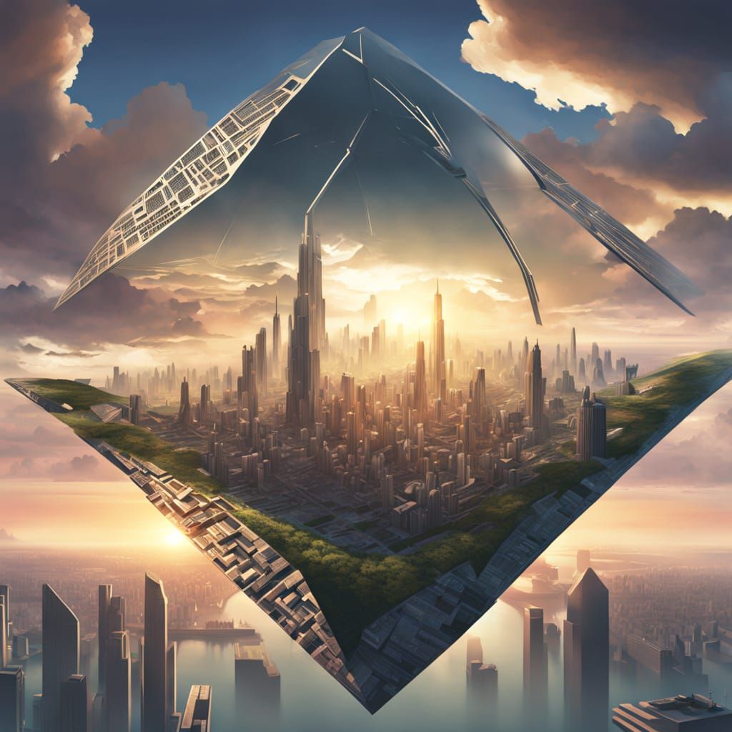 Concept art. A lone geometric object hovering over a sprawling city at twilight. The city is a symphony of towering structures. Digital painting. Intricate geometric patterns adorn the thing. A sense of vastness and technological advancement. Soft ambient lighting. technology, concept art, detailed ...