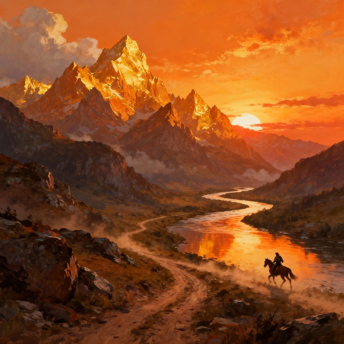 This image depicts a grand and adventurous landscape bathed in vibrant orange hues, evoking a sense of wonder and exploration.