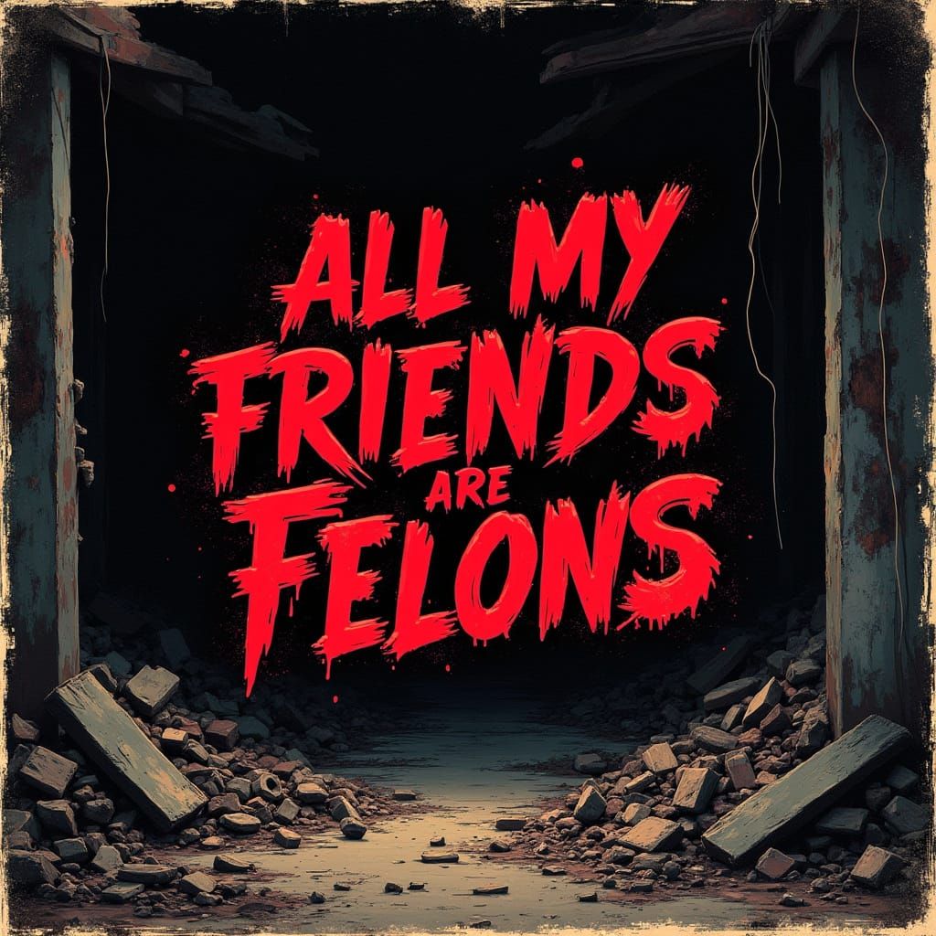 This dark, retro-style horror movie poster features bold, blood-red graffiti-like text reading 'All My Friends Are Felons' against a haunting, high-contrast backdrop of crumbling urban decay, evoking the gritty aesthetic of 80s horror and the surreal atmosphere of biomechanical art.