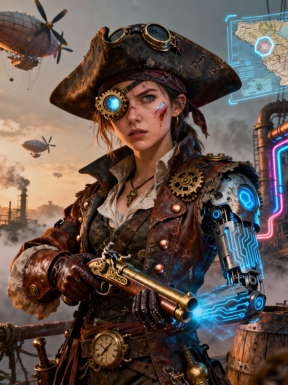 A fierce young female pirate captain in a steampunk warrior style. She holds an antique firearm and wears a detailed monocle and wide-brimmed hat. Her attire blends pirate regalia with cyborg elements.