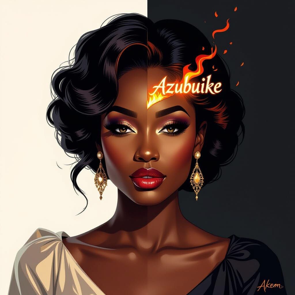 A symbolic portrait of a glamorous Nigerian woman, her face divided between light and shadow. Cinematic lighting and rich colors enhance the evocative mood.