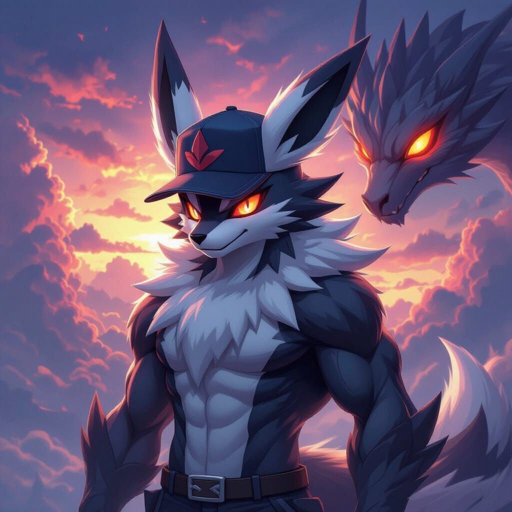 This image shows Lycanroc wearing a stylish cap and displaying strong muscles under dramatic lighting. A dragon's glowing eyes pierce through a dark, colorful sky. The artwork features realistic textures as digital art.