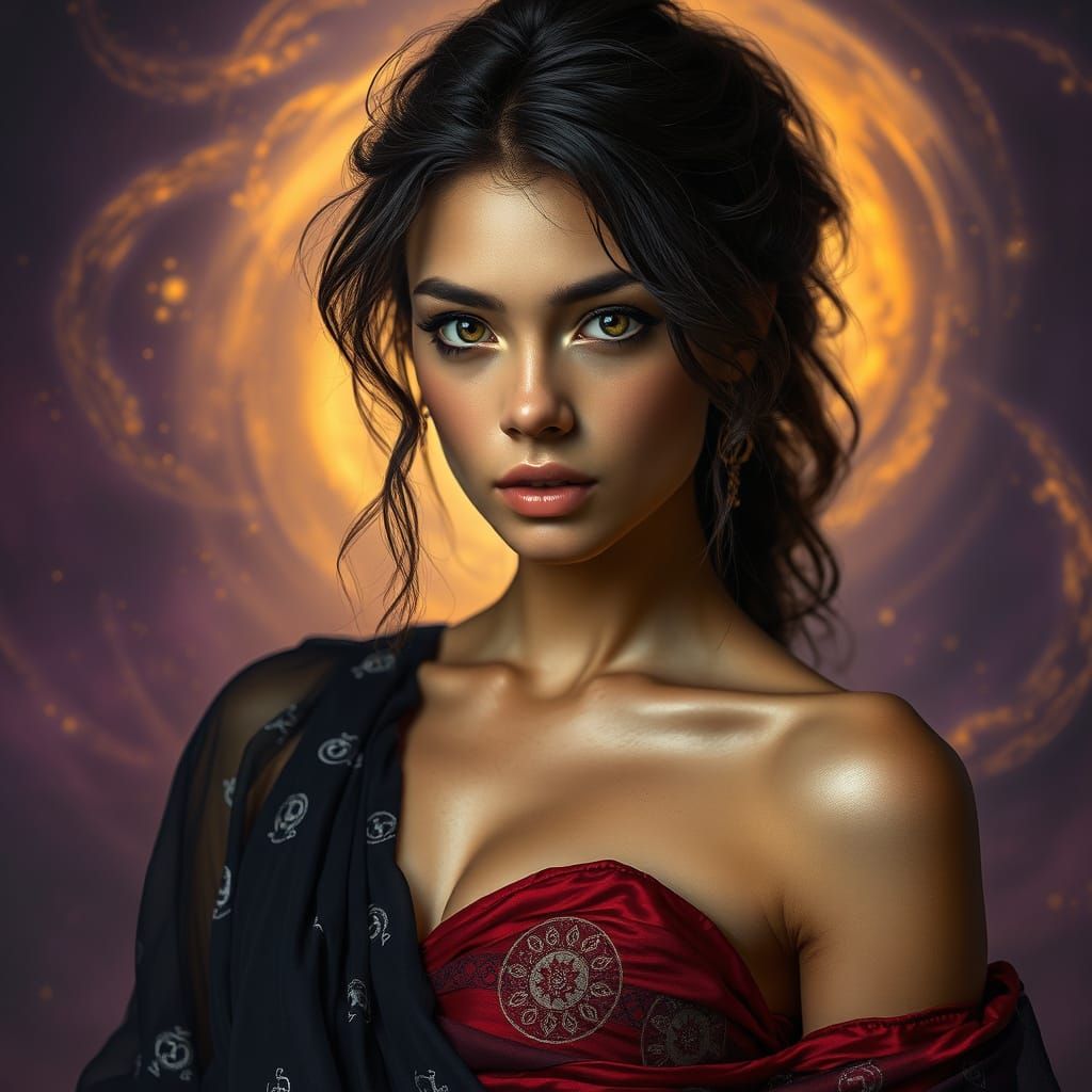 A captivating digital painting in the style of Luis Royo showcases a stunning young woman poised dramatically against a backdrop of swirling cosmic dust. She possesses striking, symmetrical features with flawlessly tanned skin flushed with rosy highlights and vibrant hazel eyes framed by a long auburn ...