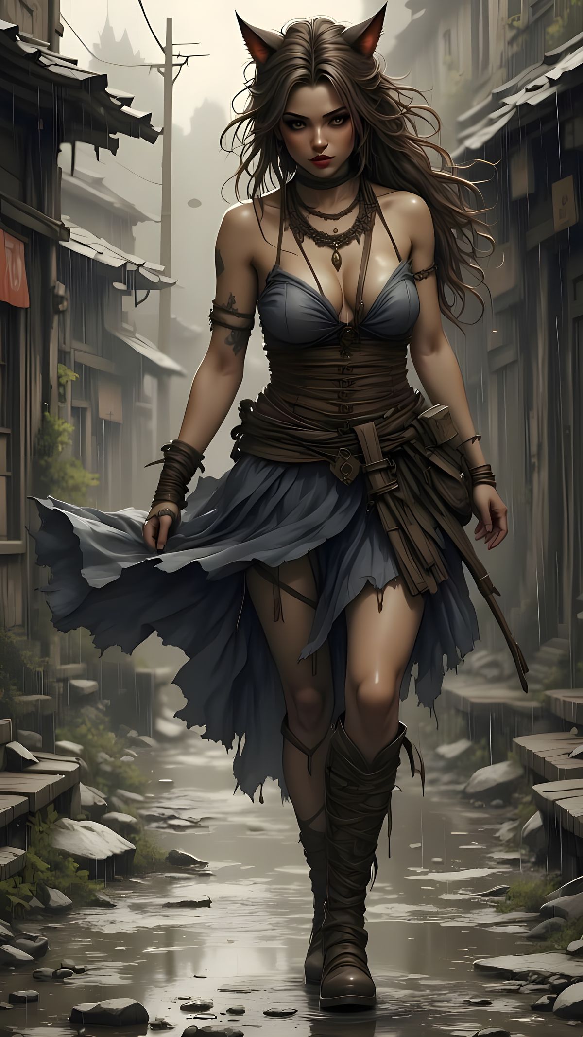 This image shows a beautiful samurai woman with cat ears dancing in the rain. Her reflection shimmers in the puddles, rendered in a hyperdetailed, romantic, Final Fantasy-inspired style.