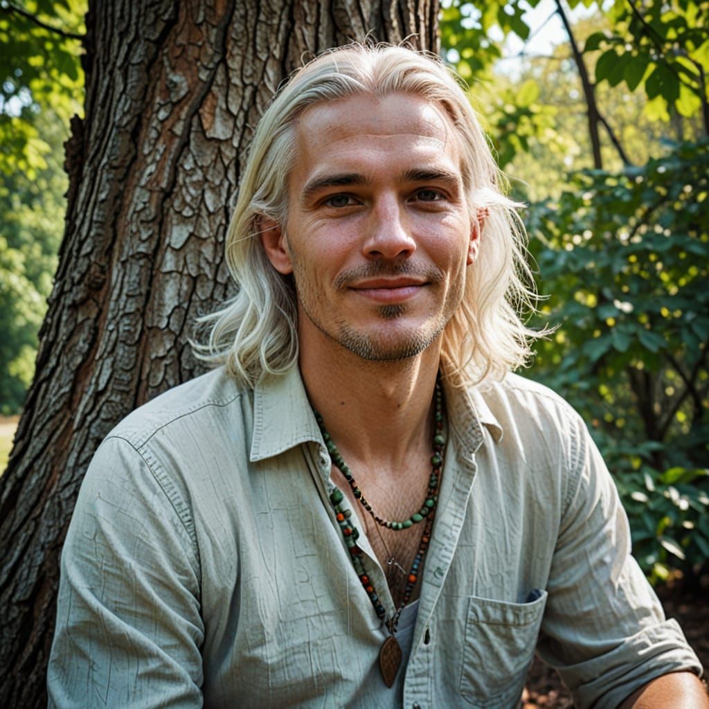 This image captures a handsome male mystic in a serene natural setting, with soft, warm light and vibrant green accents, creating a moody and atmospheric scene.